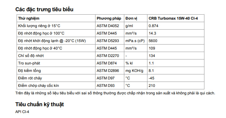 Để hiểu rõ hơn về sự khác biệt, cần xem các thông số kỹ thuật của nhớt để đánh giá độ đặc hay lỏng. Đặc biệt, việc so sánh độ nhớt ở nhiệt độ thông thường (40°C) và nhiệt độ cao (100°C) sẽ giúp làm rõ vấn đề. Dưới đây, thông số kỹ thuật của nhớt động cơ Castrol Turbomax CI-4 đã được lấy làm ví dụ để phân tích chi tiết.