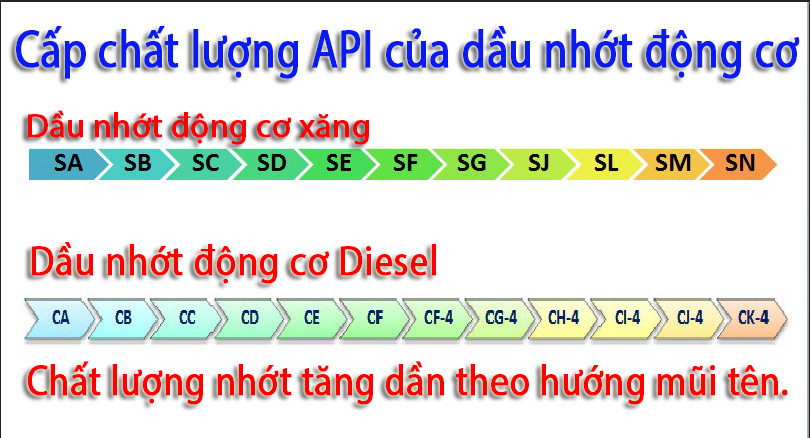 – Cấp chất lượng API dành cho dầu sử dụng trong động cơ chạy xăng bắt đầu bằng chữ cái “S”, ví dụ: SA, SB, SC, SE, SF, SG… SN.